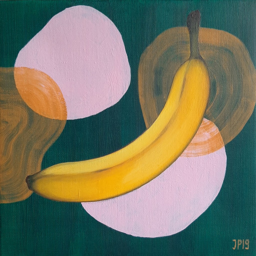Bananacloud, 100 x 70 cm, 2020Bananas floating in space, 30 x 30 cm, 2019Bananas floating in space, 30 x 30 cm, 2019Bananas floating in space, 30 x 30 cm, 2019Marching Bananas I ja II, 33 x 24 cm, 2019Chasing bananas, 30 x 30, 2019Muumimamma, 2018